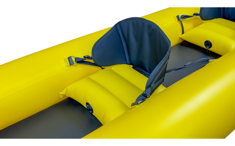 ПВХ: як і в молодшій моделі, ми використовуємо тканини різної щільності. Надміцний ПВХ 1100 г/м² захищає найбільш вразливе місце дно від проколів при контакті з камінням та корчами. Борти виконані з ПВХ 850 г/м², що полегшує загальну масу. В результаті ви отримуєте туристичну байдарку купити яку варто для найсуворіших умов.