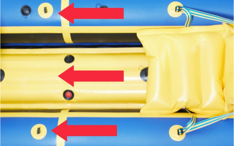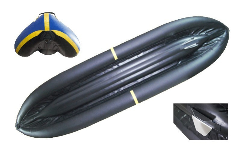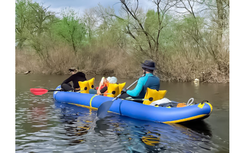 Корпус шиється з ПВХ-тканини: дно - 1100 г/м², балони - 850 г/м². На практиці це означає, що човен спокійно переживає шарудіння по гальці, корчі біля берега і часті висадки на «дикий пляж». Надувне дно низького тиску працює як подушка: гасить дрібну хвилю, пом’якшує удари об каміння та перекати, ноги не впираються в жорсткий настил. Алюмінієвий курсовий стабілізатор допомагає тримати пряму навіть тоді, коли вітер крутить або екіпаж гребе не ідеально синхронно. Для каяка для подорожей це дуже серйозний плюс - менше «змійок», менше зайвих зусиль.