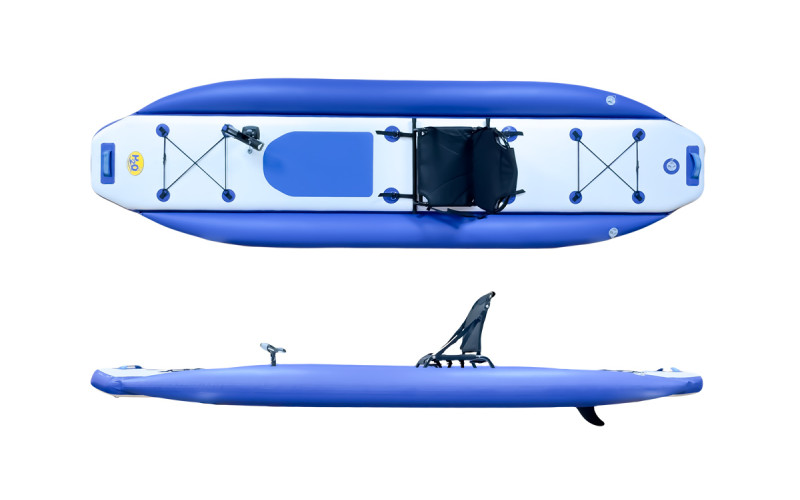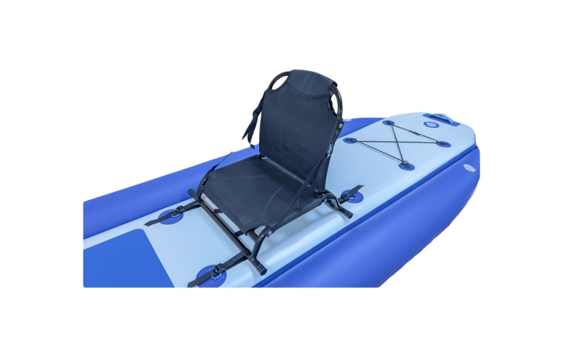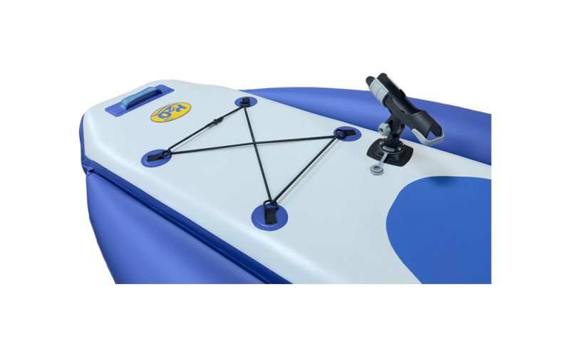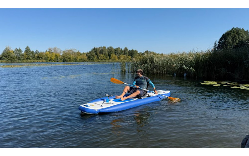 Головне питання наших клієнтів - надійність на воді. Ширина цієї моделі становить 105 см завдяки боковим балонам діаметром 20 см. Я особисто тестував покриття - ноги не ковзають навіть по мокрій поверхні. Внутрішня камера з нитками Drop-stitch забезпечує жорсткість, а посилений ПВХ гарантує довговічність. Це максимально продуманий sup board для риболовлі. На корпусі вже є кільця для кріплення каркасного сидіння (воно йде в комплекті!) і тримач для вудилища. Гребіть сидячи або стоячи, використовуючи дві карго-системи для фіксації спорядження. Три ручки по краях і в центрі допоможуть легко донести борд до води.