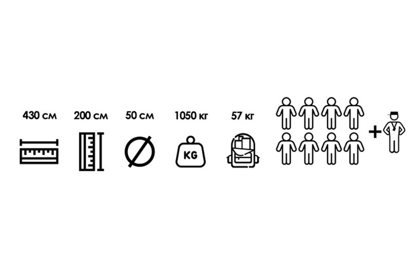 Три надувні банки (сидіння) замовляються окремо й дозволяють налаштувати посадку команди під умови та формат маршруту. Для веслярів передбачено 8 пар упорів для ніг і окрема пара для інструктора – так у команди більше шансів дійти до фінішу в повному складі. На кормі розміщене протиковзке покриття для комфортної роботи інструктора.